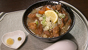 牛・豚のモツは自家製ダレでじっくり煮込んだもの。ハマグリ・ワタリガニなどでとった塩ダレと干し椎茸・煮干しなどのスープ。特注の中太ちぢれ麺。レモン・にんにく・柚子こしょうで味七変化。