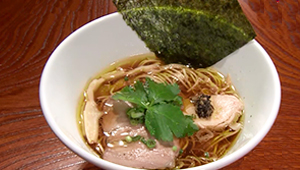 比内地鶏の丸鶏と岩手のいわい鶏のガラを使用したスープ。数種類の生醤油をブレンドしたタレ。京都の老舗製麺所の麺。黒トリュフオイルをふんだんに使った自家製オイル。