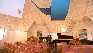 ホールのような木造ドームの建物は、修理が終わったピアノの音を確認するために建てたもの。事前の連絡で都合がつけば、見学もOKとのこと。また、音が美しく響くので数々のコンサートも開催されています。