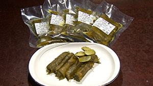 齋藤さんご夫婦がふたりでつくる「からし巻」は、石巻市の農産物直売所などで売られています。「からし巻」は河南地区で古くから食べられてきました。たくあんをカラシであえ、しそで巻いたもの。ごはんのおとも、酒のつまみにぴったり。つーーんと鼻に抜ける辛味がたまりませんよ。
