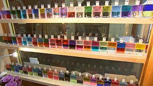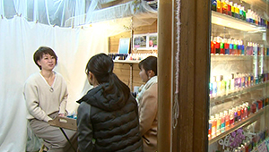 カラーケアコンサルタントの専門資格をもつ店主の岩本さんが、私たちの心の状態を教えてくれます。100本以上並んだきれいなカラーボトルの中から直感で4本を選びます。ボトルの中は2色に分かれていて、上は顕在意識、下は潜在意識を表しています。選んだ順などから自分では気づいていないこと、置かれている状態などが読み取れるそう。