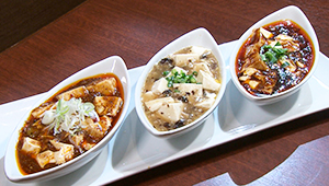 看板メニューは「三色(さんしき)麻婆豆腐」。文字通り、赤・黒・白の3種類。赤は、びりびりと辛さが際立ち、黒は、甜麺醤でコクとうまみを、白は、こだわりの自家製白ラー油と塩で素材の旨みをひきだしたやさしい辛さを。三種三様の麻婆豆腐を楽しめます。