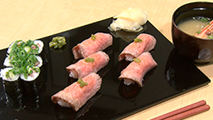 4代目の高橋理武さんはフレンチの修行を積んでから寿司の道に入りました。そのフレンチの技をいかして作っているのが、仙台牛ローストビーフの握りと巻物。仙台牛自体の良さをいかすためにシンプルな味付け、これが酢飯とよく合うんです。ぜひ一度味わってみては。