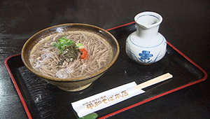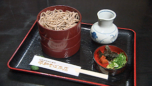 日本三大そばともいわれる“出雲そば”。こちらの「釜あげ蕎麦」は、そばを釜でゆで、そのそば湯を器に入れます。そばも水でしめることなく器へ。つゆは別だてで、好みの味になるように入れて調節していただきます。そばの実を殻ごと挽いているので色が濃く、香りがよいのが特長です。