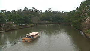 松江城を囲む堀の一部が今も残り、1周3.7kmの内堀・外堀をめぐるコースを、船頭さんのガイドを聞きながら周遊します。(遊覧時間約50分)