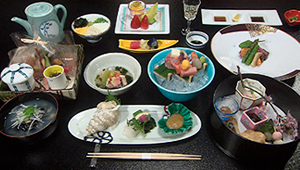 夕食は、島根の名物をたっぷりと堪能。旨みがお口の中で長く持続する「しまね和牛サーロインステーキ」は、島根県隠岐の島の塩でいただきます。宍道湖の名産シジミのすまし汁はコクのある味がたまりません。朝食でいただける家伝料理の鯛めしは絶品ですよ。
