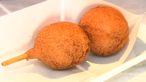 また、さくさく揚げたてのアメリカンドッグ風のかまぼこ、ひょうたん揚げは、ファストフード感覚で食べられるので、観光客の方だけでなく、地元にもリピーターが大勢います。食べ歩きにもぴったりです。