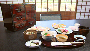 名物の「箪笥ミニ膳」。ケヤキを使い、豪華な飾り金具がついた伝統工芸品・仙台箪笥に、地元の旬の食材をふんだんに使ったお料理が入っています。ひきだしを開けると彩り豊かなお料理が次々とあらわれますよ。