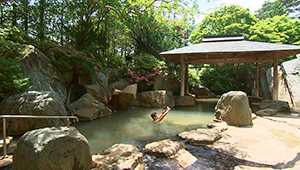 秋保温泉で一番の高台にある宿。緑水亭の自慢のひとつは、四季折々の表情を楽しめる、約1万8千坪のお庭。この敷地の広さをいかした露天風呂も爽快です。