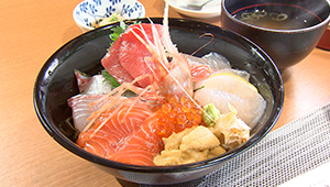 震災で店舗が全壊しましたが、2013年にレストランを再建しました。港で働く人たちのために朝7時から営業しています。看板メニューの海鮮丼は、8種類の海の幸が贅沢にのっています。白身のたんぱくな味わいとふんわりとした食感が特長のメヒカリの唐揚げも味わえます。