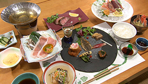 夕食は会席料理。麓山(はやま)豚のしゃぶしゃぶなど、和をベースに洋食・中華などジャンルにとらわれないオリジナルメニューを楽しむことができます。