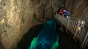 中は、夏でも上着が必要なほどひんやりとしています。静かに、美しい湧水をたたえた地底湖は“龍がいた”と昔のひとが言ったほど深く美しいブルー。2016年の台風の被害で雨水が流れ込み、一時営業を休みましたが、無事に美しい姿を取り戻しました。
