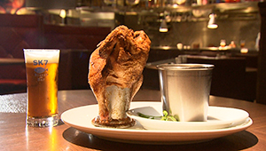 まるごとの鶏が味わえる「ビール缶チキン」が人気。もともとは、BBQ料理だそう。その迫力と、まるごとだからこそのジューシーさで評判です。ハーブやスパイス、お店のオリジナルビールの香りもたまりません。また、お肉だけではなく魚介類のメニューも充実。こちらでは雄勝産の生牡蠣を年中味わうことができます。