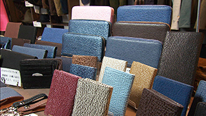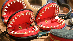 サメ革は気仙沼ならではの商品。水に強く、丈夫です。遊び心のあるデザインの小銭入れもおすすめ。