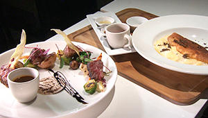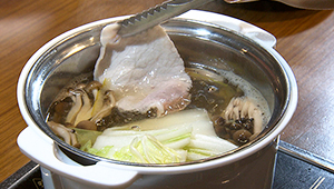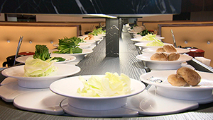 出汁はカツオ、ゆず塩などの5種類からセレクト。回転レーンに並んでまわってくる好きな具材をとって鍋を作ります。その日仕入れた旬の野菜が約10種類。お試しコースで味わえるお肉は三元豚のロース・バラ・鶏もも肉。お肉はタッチパネルで選択注文ができ、小さなトラックにのってテーブルまで運ばれてきます。楽しみながら自分好みの鍋を味わえるお店です。