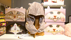 「ふわポカはぐニャンフード」は、名前の通りフードのようにかぶると、かわいい猫耳が。さらに、スイッチを入れると肩の部分がやさしいあたたかさで包まれます(USB電源使用可)。