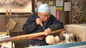大きな菊を描いた胴の部分と、やさしい表情が魅力的な鳴子こけしは、首を回すとキュッキュッと音が鳴るのが特徴です。