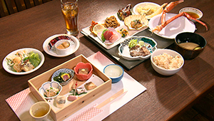 自慢のお風呂は、肌にもよいとされる上質なアルカリ泉。源泉かけ流しで、やわらかく心地よい湯ざわりです。お食事はセミバイキング。前菜の箱盛り、さらに約50種類の中からお好きなものをセレクト。紅葉、雪景色、季節ごとの美しい景色を楽しめる露天風呂と旬の食事を満喫してください。