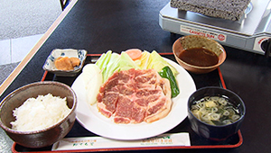 定食は、味噌で漬け込んだ田尻特産の豚肉をテーブルで焼きながらいただきます。鉄板として富士山の溶岩を石板にした“巻狩石”を使用。これで焼くとやわらかく仕上がるんだそうです。ぜひ味わってみてください。