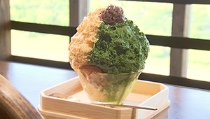 こちらの甘味は全て手作りで、そのおいしさはお蕎麦とともに評判です。氷、氷を削る際の温度を吟味、抹茶は点てて使用、寒天・あんこ・塩豆、わらびもちを手作りしています。器も特注品というこだわりの詰った逸品。すばらしい眺望と甘味、ゆったり大人の時間が過ごせる空間です。