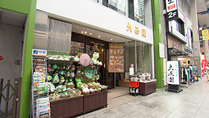 老舗のお茶屋さん、縁起物の和雑貨が充実。季節に合わせて店頭のディスプレイを替え、アーケードを通る人の目も楽しませてくれています。店の奥には茶房もあり、和菓子と抹茶をいただけます。