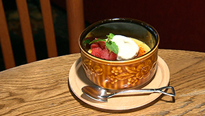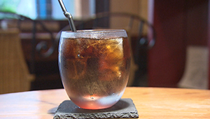 カフェのこの時季のおすすめは「水出しコーヒー」。じっくり時間をかけて一滴ずつ抽出したこだわりの一杯です。スイーツ気分のいちごミルクや本格的なクレームブリュレも人気だそう。