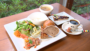 お店の名前は、フランス語で挨拶を意味する言葉。緑と雑貨があふれるどこか懐かしい感じのカフェ。毎日お店で焼き上げるフランスのパイ料理「キッシュ」と、天然酵母を使ってつくる自家製のパンが評判です。