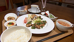 平日限定、メインが替わるランチは、野菜中心に小鉢4つや汁物もついています。土日のパスタランチは、パスタは常時7種類+限定の中からセレクトできますよ。