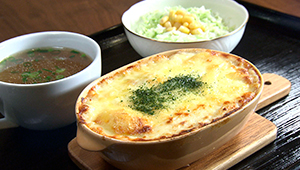 一番人気の「海老のマカロニグラタン」。自家製のベシャメルソースとたっぷりのモッツアレラチーズを、海老とマカロニにからめたまろやかなグラタンです。