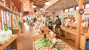 どどんこ、とは、この宮崎地区にある熊野神社のおまつりで獅子舞が出るときに鳴らす太鼓の音からつけたもの。2017年の4月にオープンし、新鮮な野菜や地域の工芸品などが並んでいます。