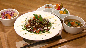 ベジタリアンのカフェ。経営している畠山さんの家は代々の農家で、当主の名前を店名にしました。無農薬・有機野菜にこだわり、見た目にもこだわっています。テーブルに運ばれてきたときにきれいで驚きがあるようなひと皿を心がけているそう。