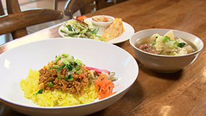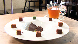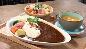 1階のレストランでは、カカオをテーマにベテランシェフのアイデア光るメニューが味わえます。自慢のカレーにはチョコレートがたっぷり入り、深いコクを加えています。デザートのチョコレートは、味噌やしょうゆなどの和テイストで、新たな味を楽しめます。