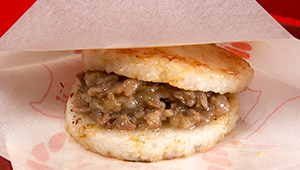 島根和牛ご縁ライスバーガーは地産地消グルメ。肉質がよく、甘みとやわらかさが特長の和牛を甘めのしょうゆダレで仕上げています。