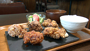 のりうどんのビビン麺は冷麺のような感覚。のりうどんを食べ慣れている、地元の人たちにも好評です。からあげ5種盛り定食は、特製、ピリ辛、味噌、塩、ユーリンチーと、違った味わいのからあげを一度に楽しめます。