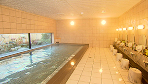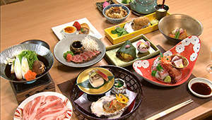 旅の疲れを癒してくれる大浴場は、天然鉱石を使った人工温泉。日帰り入浴もできます。夕食は海の幸と山の幸、地元の食材を生かした会席膳です。料理長がひと品ひと品、腕によりをかけて作った料理が並びます。