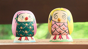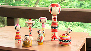 ろくろ線の模様が特徴の弥次郎系伝統こけし。日本画の染料を使い、ひとつひとつ手作りされています。伝統を守りながら、いま、疫病から人々を守るといわれ注目されているアマビエのこけしも登場しました。色も可愛らしく、インテリアにも。絵付け体験もできます。