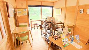 本はご主人のセレクト。お店のイラストも手がけています。奥様がつくる食事やスイーツも自慢。大豆を使ったヘルシーなクッキーや豆乳のプリン、地元のものがふんだんに使われた定食や、そばを洋風アレンジした新しいメニューも。やすらぎの時間を過ごせます。