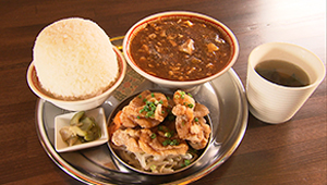 シマハン定食は、ごはんがこんもり、まさに山盛り。おかずはご飯がすすむ四川麻婆豆腐や油淋鶏などボリューム満点です。また、黒納豆を使った麻婆豆腐もおすすめ。シマウマの看板が目印です。