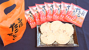 お土産にも喜ばれるたこせんべいは甘みの後ほんのりピリ辛。全部で50種類ほどあるそう。