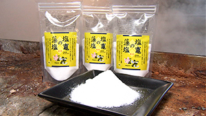松島湾の海藻と海水を使用。時間をかけて煮詰めて粒子の細かい真っ白な藻塩が完成します。