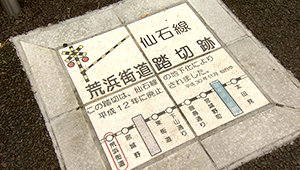 平成12年に仙石線地下化にともない廃止された14の踏切の跡を残す表示。
