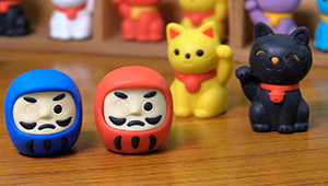 天満宮そばの“勉強がはかどる文具店”。7色のころんとかわいいダルマや招き猫の合格消しゴムなど、学業をバックアップする文具が揃っています。