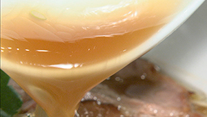| ●鶏油 | スープにコクを出すため、比内地鶏を熱して抽出する鶏の油 鶏油(チーユ)も使用。 |