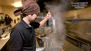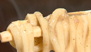 | ●特注の太麺 | 麺を作る時に小麦粉に対して加える水の割合を低めにし、小麦粉の風味が出るような仕上がりに。 |