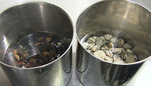 | ●自家製のつくね | 鶏のひき肉とアサリのむき身で作る。 |