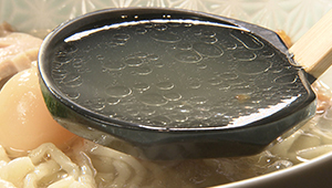 | ●スープ | 豚のゲンコツ、鶏がら、煮干や昆布でとるスープ。さらに鶏ひき肉と骨付きモモのスープを加えたスープに貝エキス入りの特製塩ダレ。 |