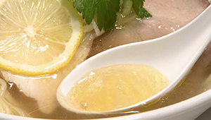 スープのうまみはしっかりしながらするすると入っていく、レモンで味の変化も楽しめ、女性にも好まれるさわやかな一杯。