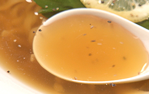 | ●スープ | 鶏がら、鶏肉、昆布、しいたけをじっくり煮たスープ 3種のしょう油でつくる特製のしょう油だれ よく冷やしてあわせたもの |