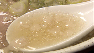 とんこつでは少ない塩味。透明度の高いとんこつスープを作るために低温でじっくり抽出。