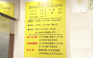 | ●スープ | 大漁の豚骨や鶏がらを強火でじっくり オープン以来継ぎ足しこまめに調整を重ね、コクとうまみがたっぷり 濃口しょう油の特製ダレ |